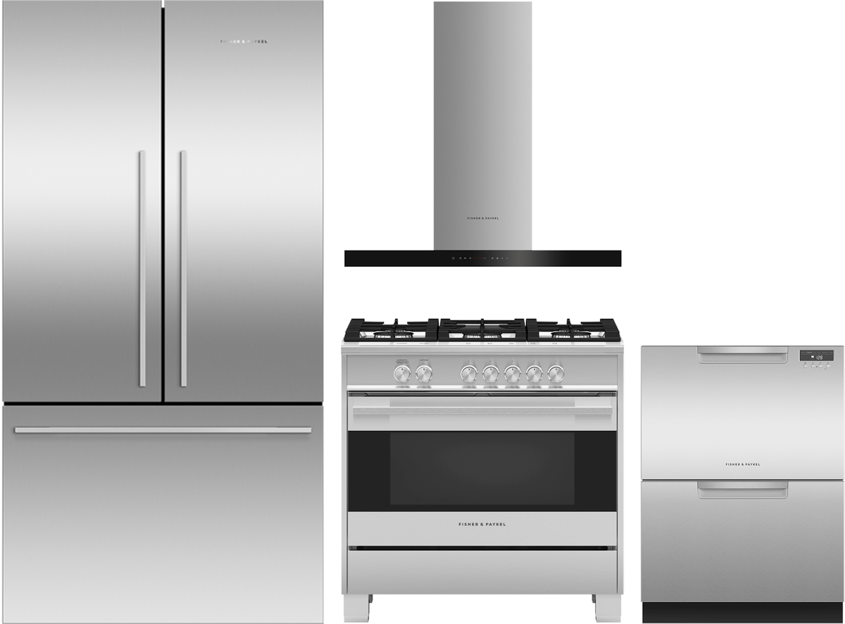 Fisher & Paykel 4 Stainless Steel Piece Kitchen Appliance Package with a french door refrigerator, pro style gas range, double drawer dishwasher and wall mounted range hood.Read More