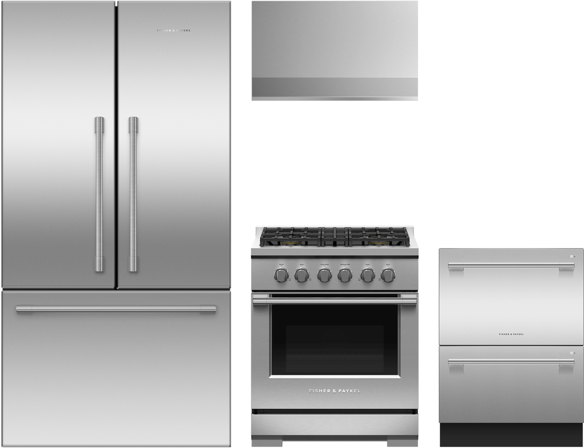 Fisher & Paykel 4 Piece Stainless Steel Kitchen Appliance Package with a french door refrigerator, pro style gas range, double drawer dishwasher and wall mounted range hood.Read More
