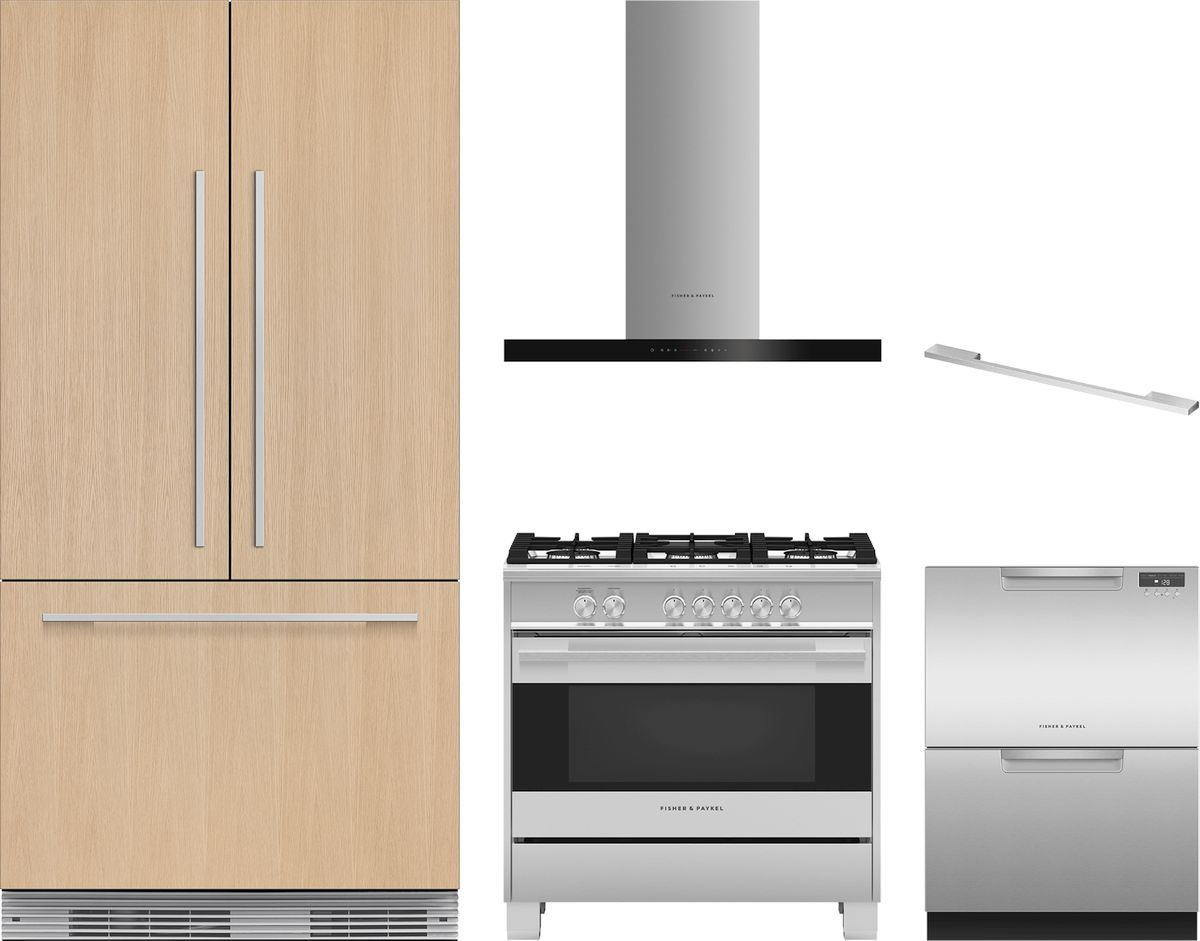 Fisher & Paykel 5 Piece Kitchen Appliance Package with a french door built-in refrigerator, pro style gas range, double drawer dishwasher, wall mounted range hood, and handle kit.Read More