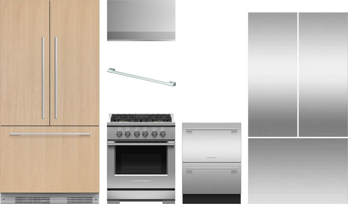 Fisher & Paykel 5 Piece Kitchen Appliance Package with a french door built-in refrigerator, pro style gas range, double drawer dishwasher, wall mounted range hood, door panel kit and handle kit.Read More