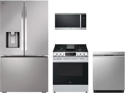 LG 4 Piece PrintProof® Stainless Steel Kitchen Package with French door refrigerator, front control built-in dishwasher, slide-in gas range, and smart over the range microwave.Read More