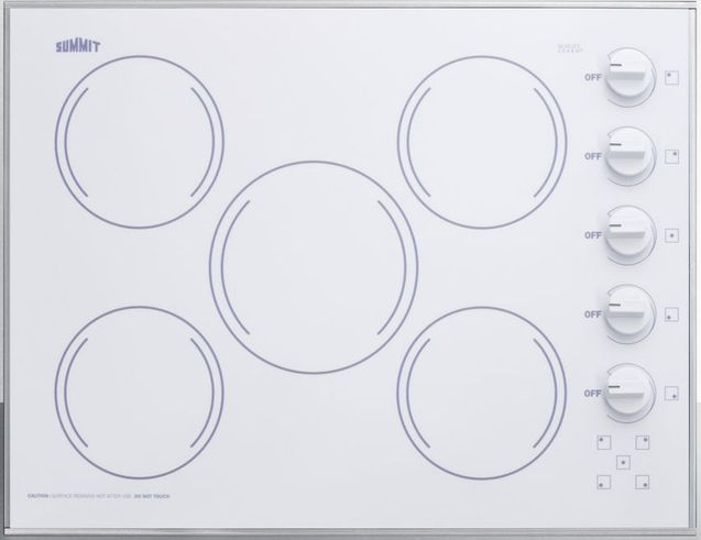 SUMMIT introduces a new series of smooth-top electric cooktops sized for unique kitchen counter spaces, all made in the USA with the industry's best elements. The CR5B274W is a 230V 6600W cooktop, with all burner elements made by E.G.O in Germany. This unit includes one large 8" 1800W element located in the center to accommodate large cooking vessels. Four standard 1200W 6 1/2" burners meet most heating needs. Push-to-turn knobs offer added safety, with an attractive matte white finish to complete the look. Each burner includes an indicator light. The smooth surface is made from ceramic Schott glass in a classic white finish, offering easier cleanup than traditional coil elements. The unit is finished with a sleek trim in 304 grade stainless steel for added durability. Sized with an exterior width of 27" and a conveniently shallow 20 1/2" depth, the CR5B274W can fit in cutouts 25 1/4" W x 18 3/4" deep. Designed and manufactured in the USA, the CR5B274W is the perfect way to finish any small kitchen space. For this unit in a black glass finish, see the CR5B273B.