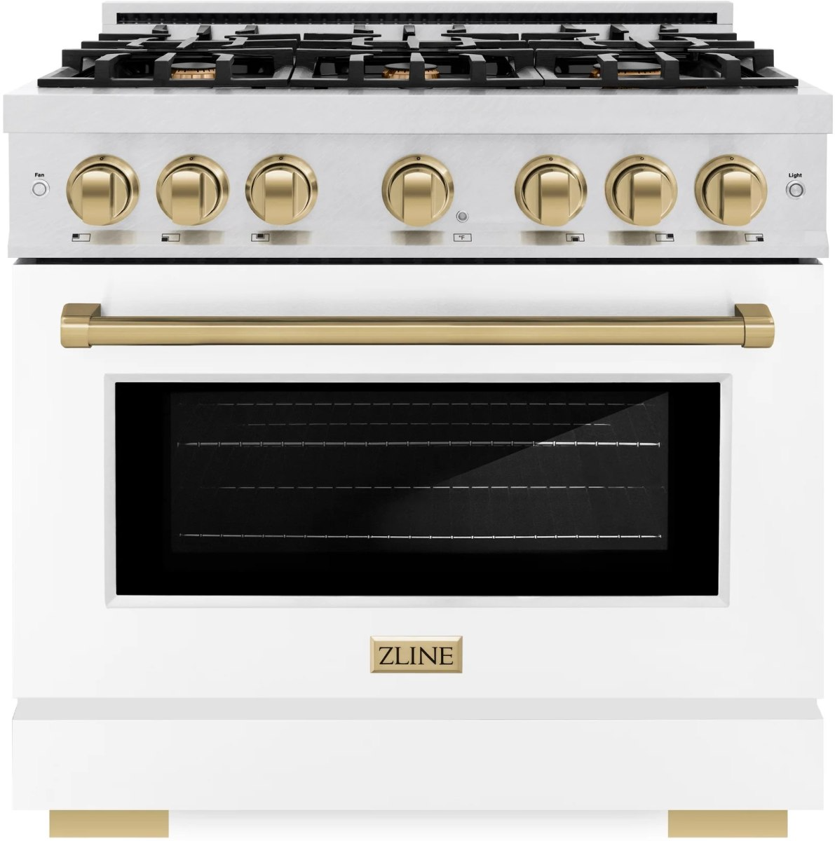 he ZLINE Autograph Edition 36 in. 5.2 cu. ft. Select Dual Fuel Range with 6 Burner Gas Cooktop and Electric Convection Oven in Satin Stainless Steel with White Matte Door and Champagne Bronze Accents (HDRSZ-WM-36-CB) combines the elegance of a hand-finished porcelain gas cooktop with 6 Italian-made auto-reignition burners, an electric convection oven with an energy-efficient cooling fan to ensure quiet operation, a beautiful white matte door with a Horizon window design, and stunning champagne bronze knobs and handle allowing you to master every meal.